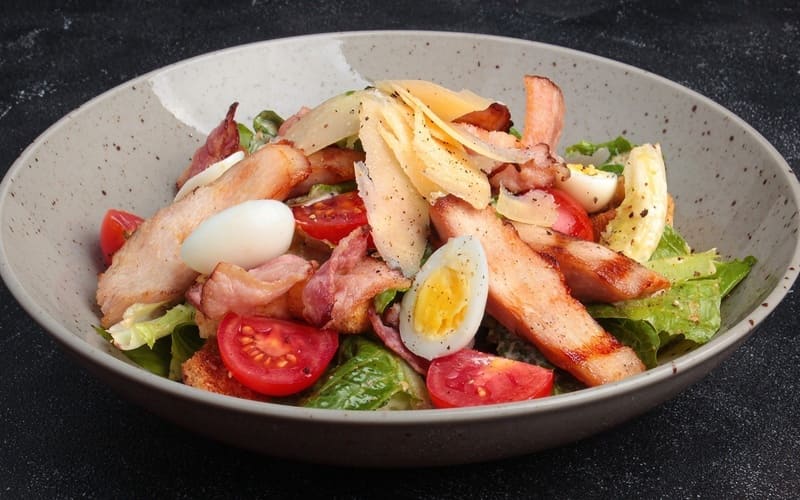 سلطة سيزر خفيفة ومغذية في نفس الوقت مع دجاج مشوي طري، أوراق خس آيسبرغ مقرمشة، خبز محمص عطري، بارميزان وصوص